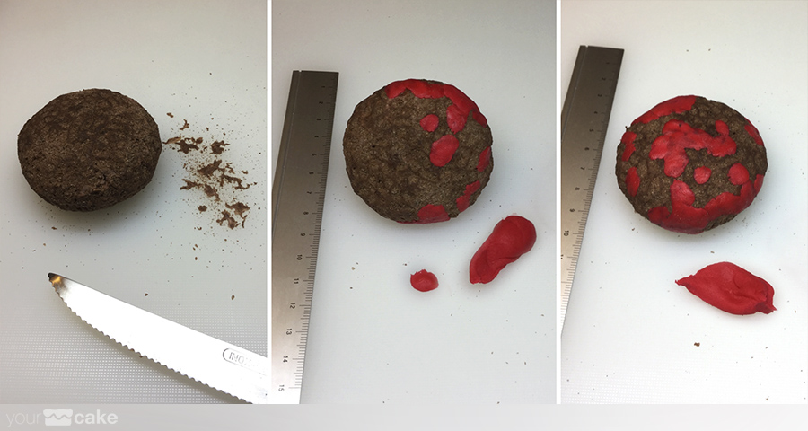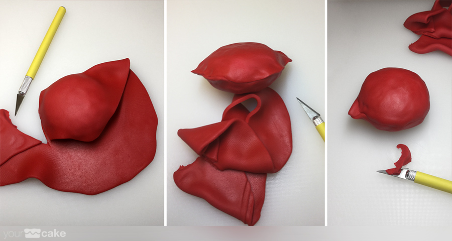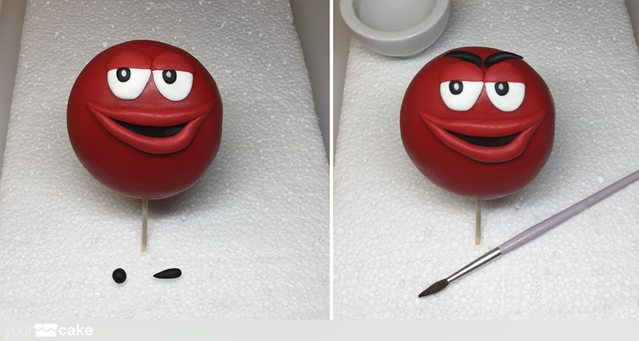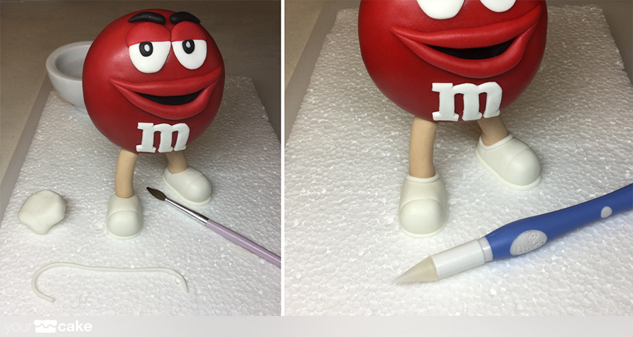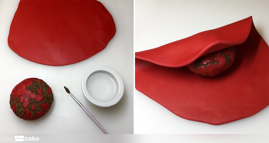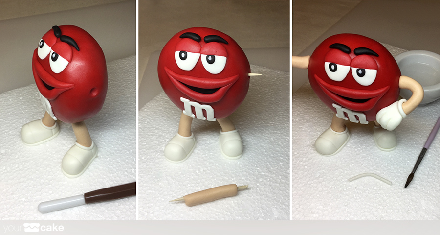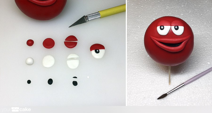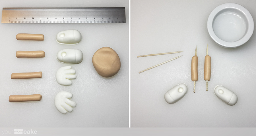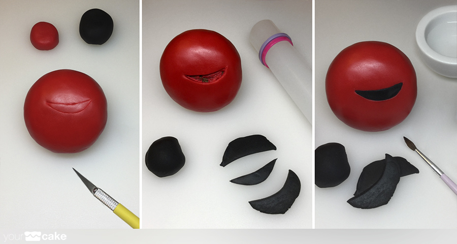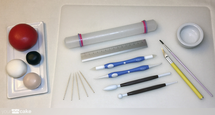 fondant de color rojo para el cuerpo de la figura, y color negro, blanco y beige para los detallesun poco de agua o pegamento para fondantCMC (Carboximetil Celulosa)palillos pequeñosuna esfera RKT o poliestireno como base